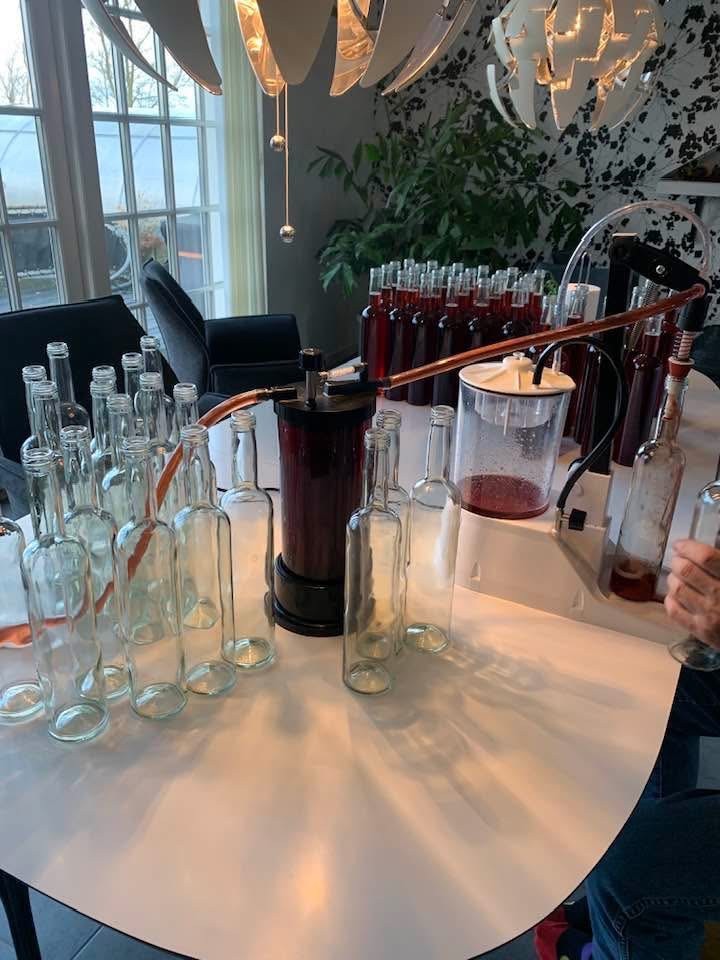 Vi har investeret i et nyt og opgraderet tappeanlæg (Der tappes ½ liters jordbærvin)